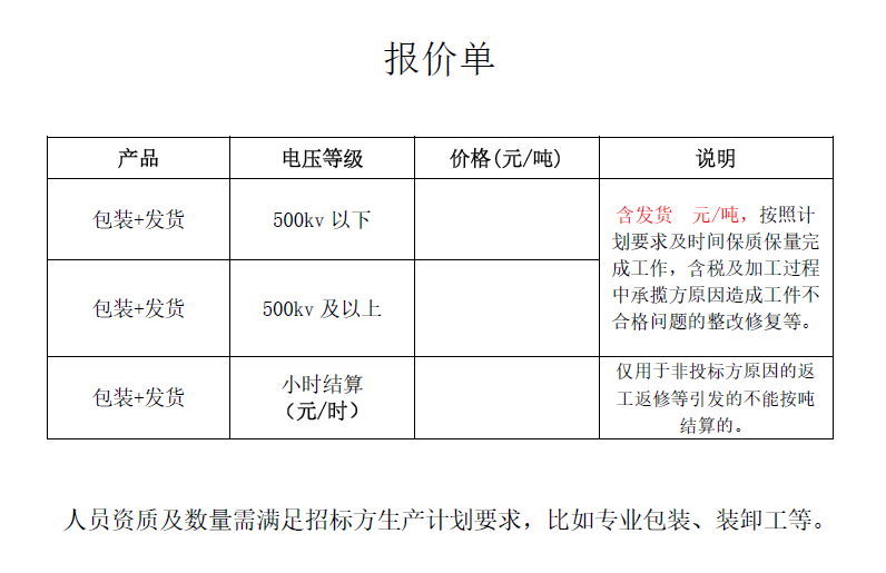 4、如因投標(biāo)方特殊情況,經(jīng)與人力資源部溝通后,可郵寄或送達(dá)至接收地址:梁鳳娟18100377087山東省膠州市鋪集鎮(zhèn)鞏家莊對(duì)面,青島匯金通電力設(shè)備股份有限公司(郵寄時(shí)務(wù)必備注好貴公司名稱+報(bào)價(jià)項(xiàng)目名稱,投標(biāo)相關(guān)資料必須確保密封、完好無損)。