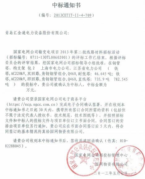 在剛剛結(jié)束的國網(wǎng)第二批鐵塔項目招標中,我公司共中標9983噸,其中江蘇電力公司中標總計782.545噸,北京電力公司中標總計829.074噸,山東電力集團公司中標6178.76噸,山西省電力公司中標2192.792噸。