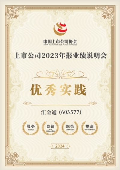 2024年12月3日,中國上市公司協(xié)會(huì)發(fā)布“2023年報(bào)業(yè)績(jī)說明會(huì)最佳及優(yōu)秀實(shí)踐”榜單,經(jīng)上海證券交易所、中證中小投資者服務(wù)中心、證監(jiān)局、中國上市公司協(xié)會(huì)綜合評(píng)定,匯金通連續(xù)兩年入選“年報(bào)業(yè)績(jī)說明會(huì)優(yōu)秀實(shí)踐”案例。